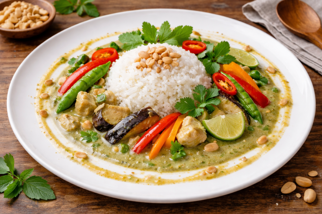 おしゃれな盛り付けは、グリーンカレーをより美味しく楽しむための秘訣です。