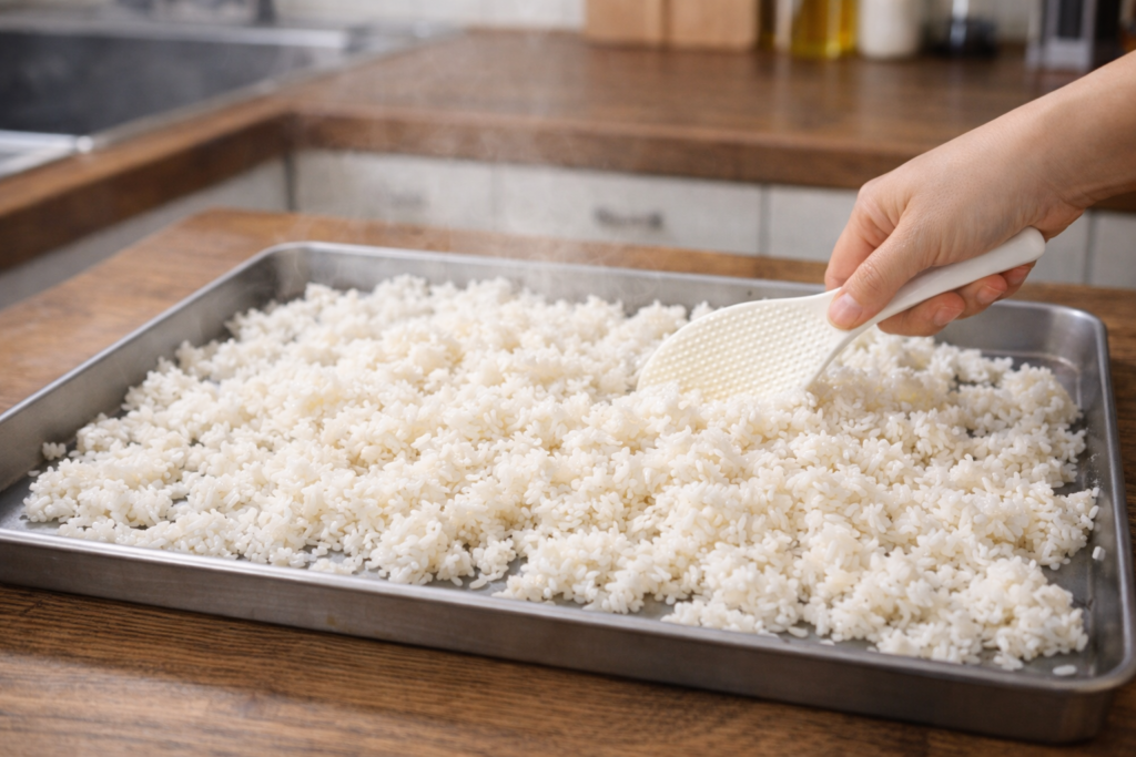 おすすめは、バットや大きめの皿にご飯を広げ、表面の水分を飛ばす方法です。