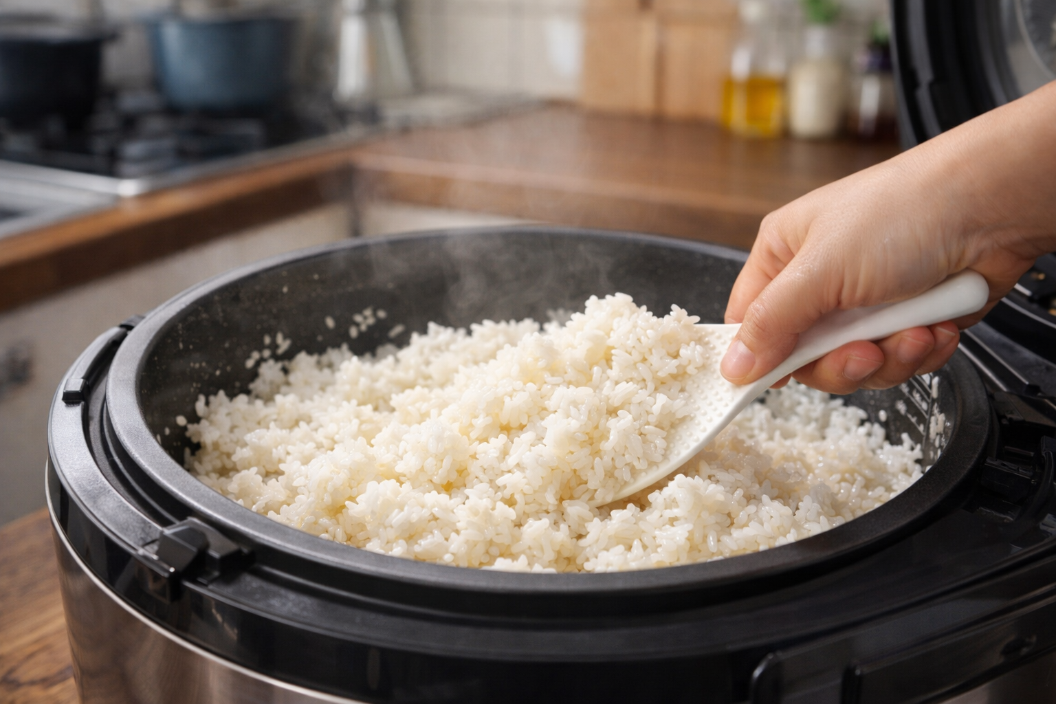 対策はシンプルで、炊き上がったら蒸らしを終えたあとに蓋を開け、しゃもじで切るように全体をしっかりほぐすことです。