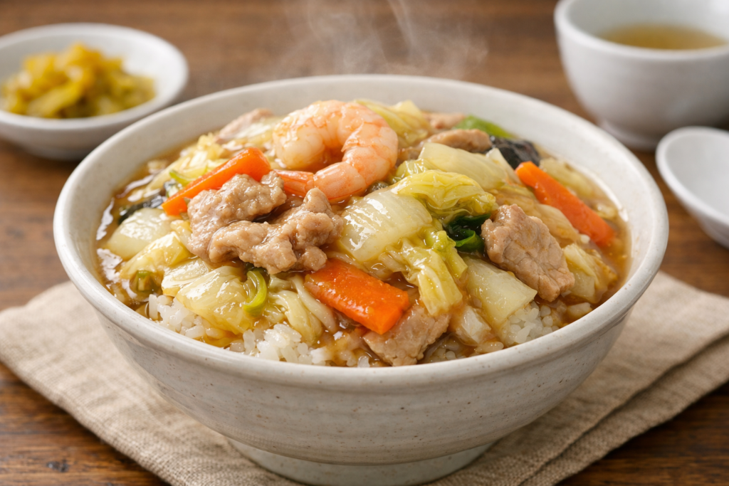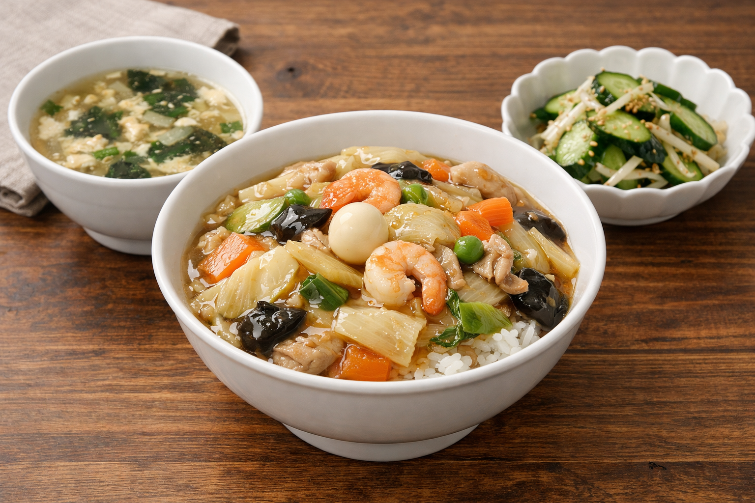 中華丼は、あんかけの旨みがしっかりしている分、「付け合わせは何を出せばいいのか」で迷いやすい料理です。