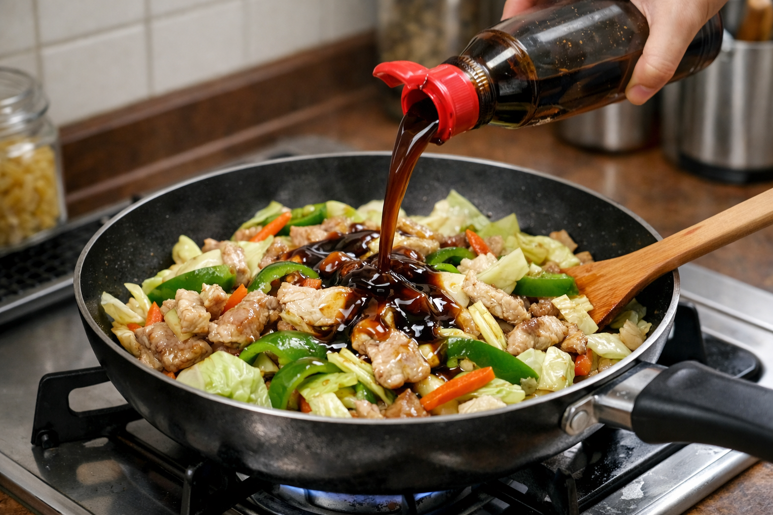 肉野菜炒めでは、醤油の代わりにオイスターソースを使うだけで、コクのある味付けになります。