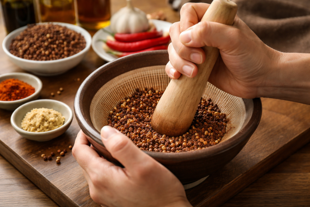 すり鉢で軽く押しつぶすようにすると、皮が細かく砕け、花椒特有の爽やかな香りがしっかり立ちます。力はほとんど必要ありません。