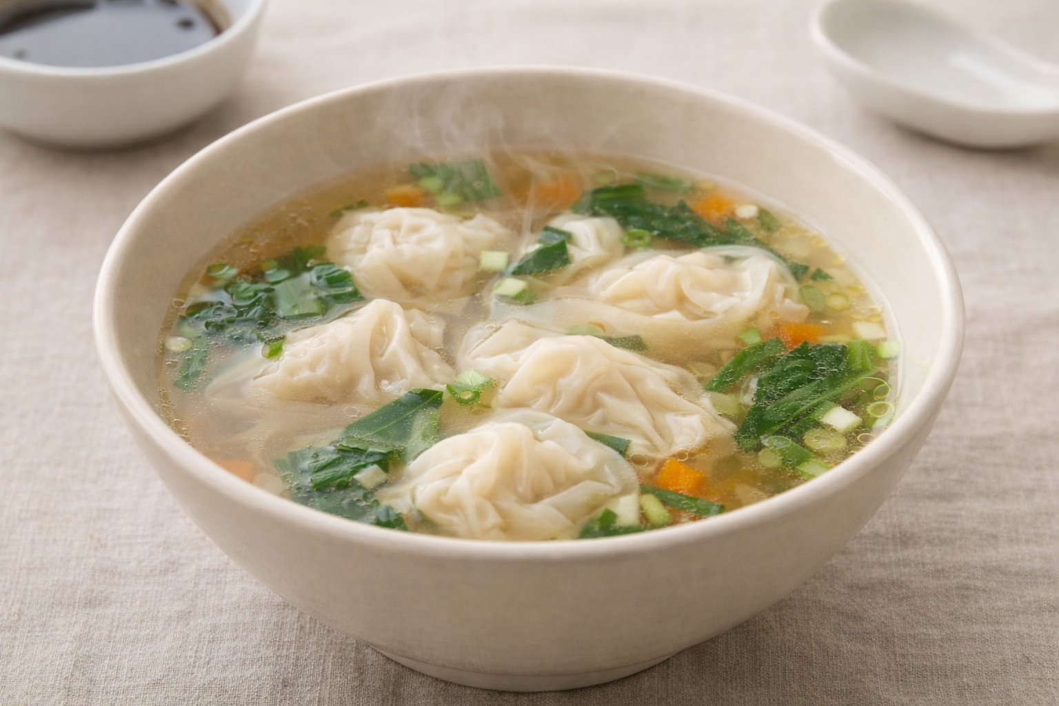 ワンタンスープは通常、ワンタン、スープベース、香味野菜、調味料から構成されます。