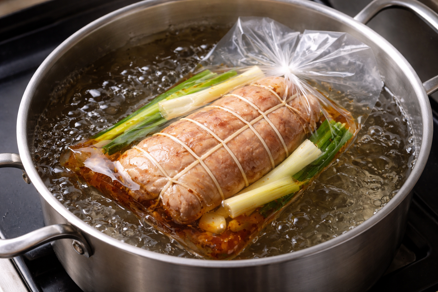 一般的には、豚肉の表面をフライパンで軽く焼き、調味料と一緒に耐熱袋へ入れたあと、鍋の湯で加熱します。