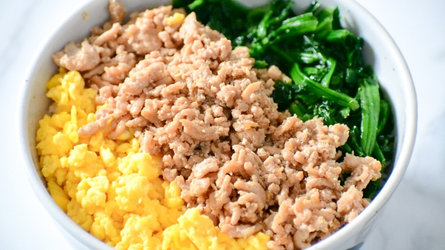 また、ほうれん草やいんげんなどを茹でて添えると三食そぼろ弁当になり、緑色が映えて見た目の彩りも良くなりますよ。
