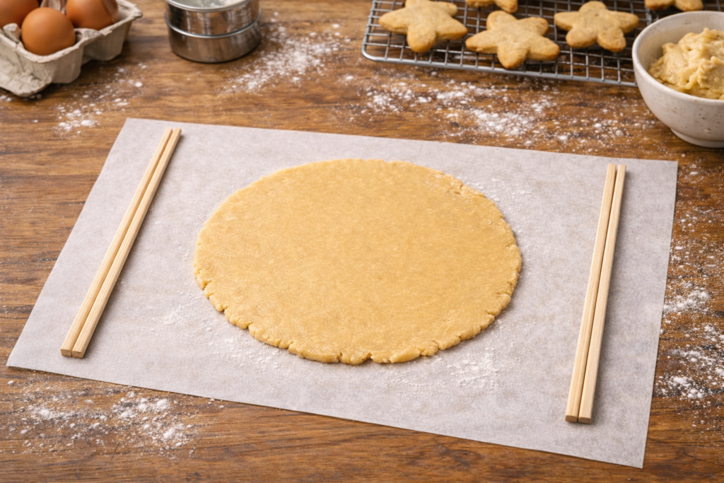 一般に売られている割り箸の平均の厚みは約4㎜で、クッキーのレシピなどを見ると生地の厚みはだいたい3~5mmですから、割り箸はどこのおうちにも必ずありますし、100均でも買える一番安価で優れた代用品と言えます。