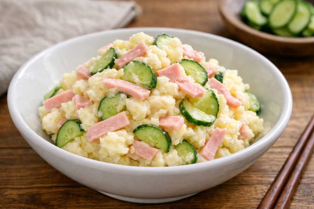 カレーうどんのもう一品。おすすめの1つ目の副菜はポテトサラダです。