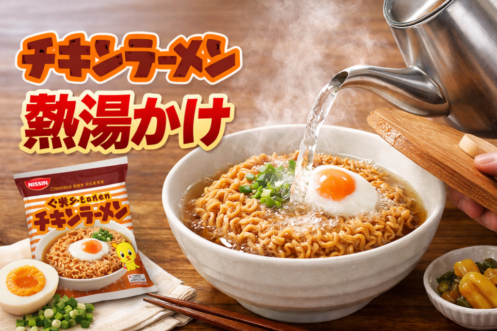 チキンラーメンの水の量は、【熱湯かけ=400ml】【熱湯煮こみ=450ml】が公式の目安ですが、好みに応じて多少調整しても問題ありません。