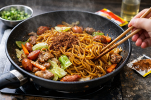 (3)麺を5分茹でたらお好みの量の醤油とごま油を少々入れ、味を整えます。